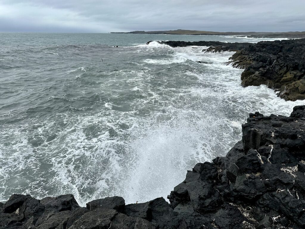 Da uns die Straße weiter entlang am Meer führte, hielten wir kurzerhand in Brimketill (lava rock pool) an. Da es sehr windig war, war das Meer natürlich ordentlich in Bewegung und die Wellen schlugen hoch an den Felswänden. Daher konnte man vom dem Lava Rock Pool nicht viel erkennen. Der Volksmund erzählt, dass der Lava Rock Pool regelmäßig von einer Riesin namens Oddný bewohnt wurde. An diesem Tag sicherlich nicht. Sie ist bestimmt wie wir, lieber zur „Blauen Lagune“ weiter gefahren.