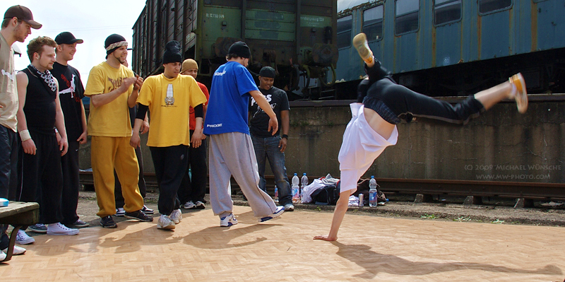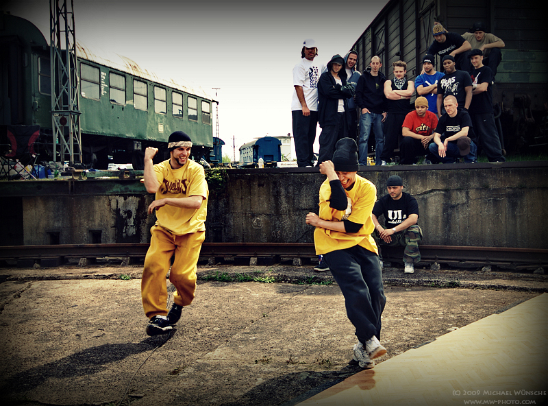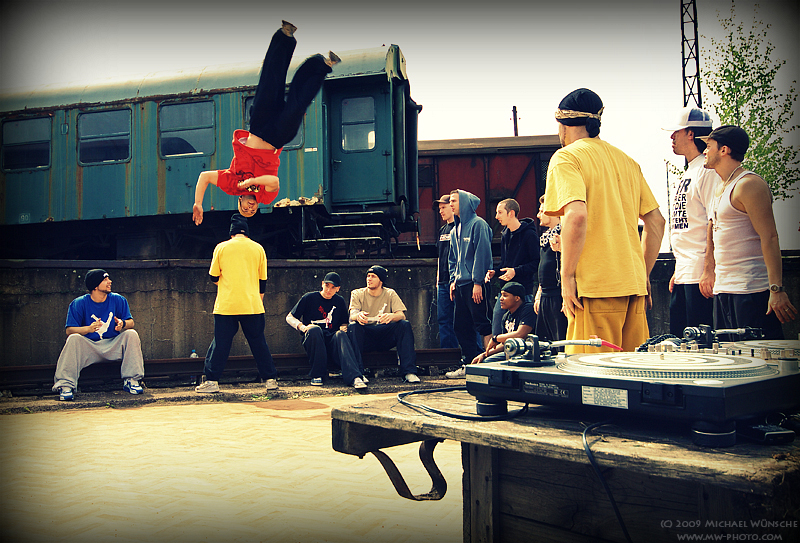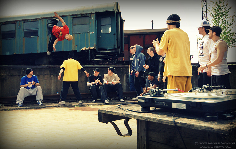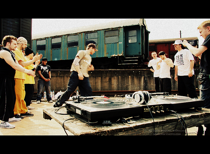 Mein Kumpel und ich waren auf dem Hanauer Güterbahnhof unterwegs um ein paar alte Loks zu fotografieren. Zur gleichen Zeit waren die Offenbacher Jungs von „ohne fronten crew“ dort und hatten ihr Video zum Titel „Forever Hip Hop“ gedreht. Was soll ich sagen, geiles Wetter, geile Lokation, klasse Hip Hop und ich hin zu den Jungs und einfach mal gefragt ob wie sie fotografieren können. Kein Problem und echt eine coole Truppe. ich weiß noch die Kamera glühte und die Speicherkarte war ratz fatz voll. Genialer Tag. Danke dafür.