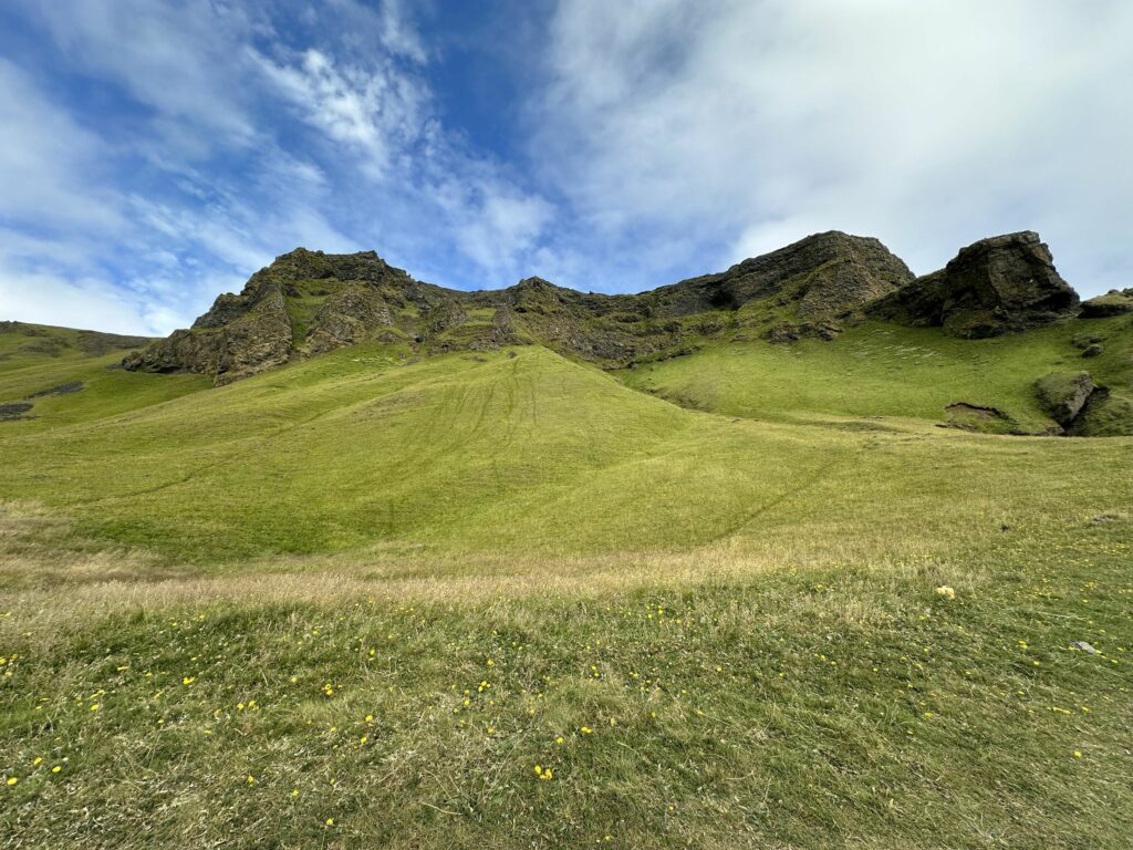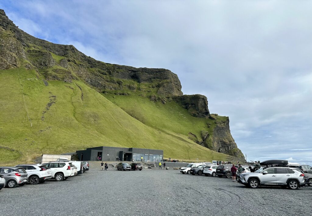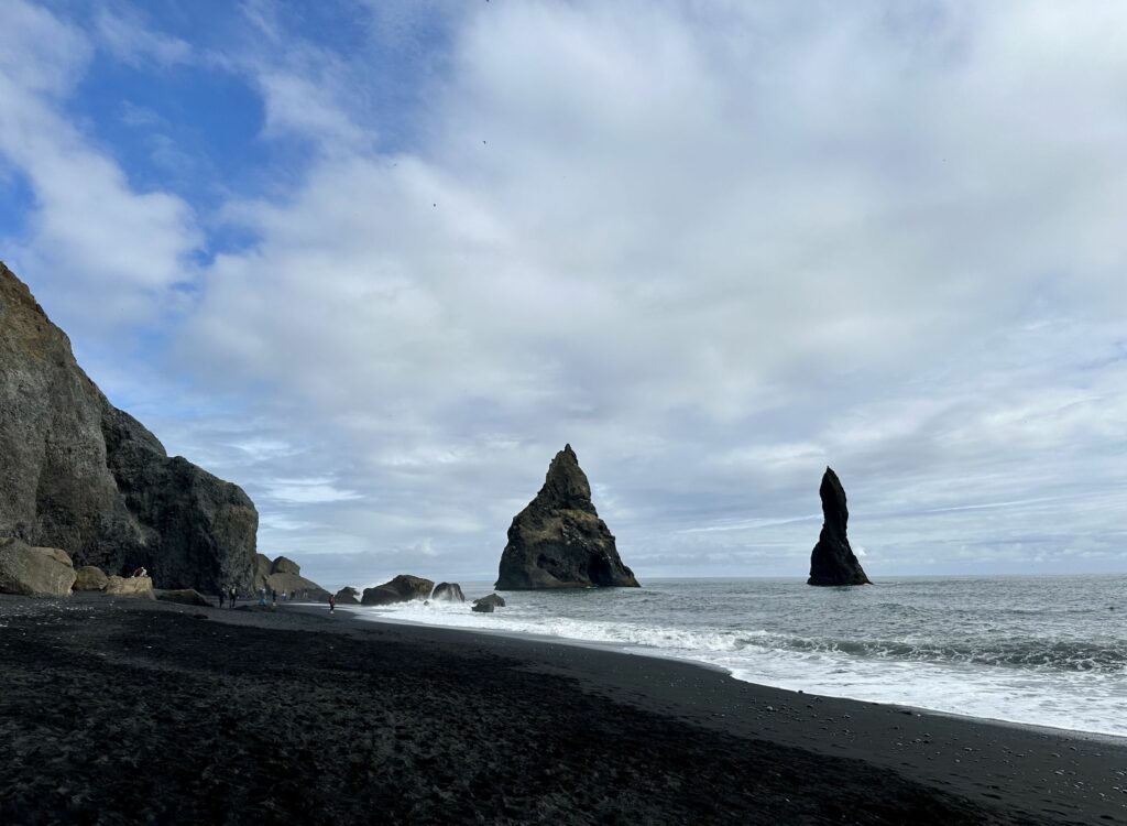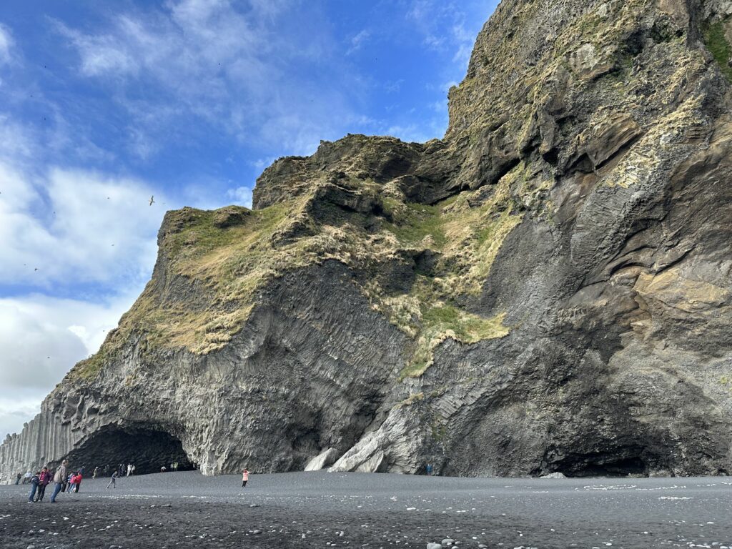 Der Parkplatz befindet sich fast direkt am Strand. Dieser tiefschwarze Sand lässt mich für einen Moment mit offenem Mund stehen bleiben. Am Felsen sahen wir hunderte von Papageitauchern. Putzige, quirlig herum flatternde bunte Vögel, die immer wieder vom Felsen auf das Meer hinaus-segelten und mit Fisch im Schnabel wieder zurück kamen. Ich hatte leider meine Kamera im Auto liegen lassen und war ehrlich gesagt zu faul zurück zu laufen, um diese zu holen. Daher entgingen mir natürlich Nahaufnahmen der Papageitaucher. Im Nachhinein Schade.