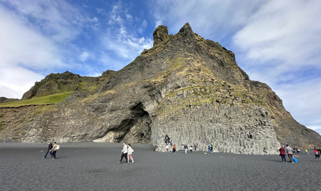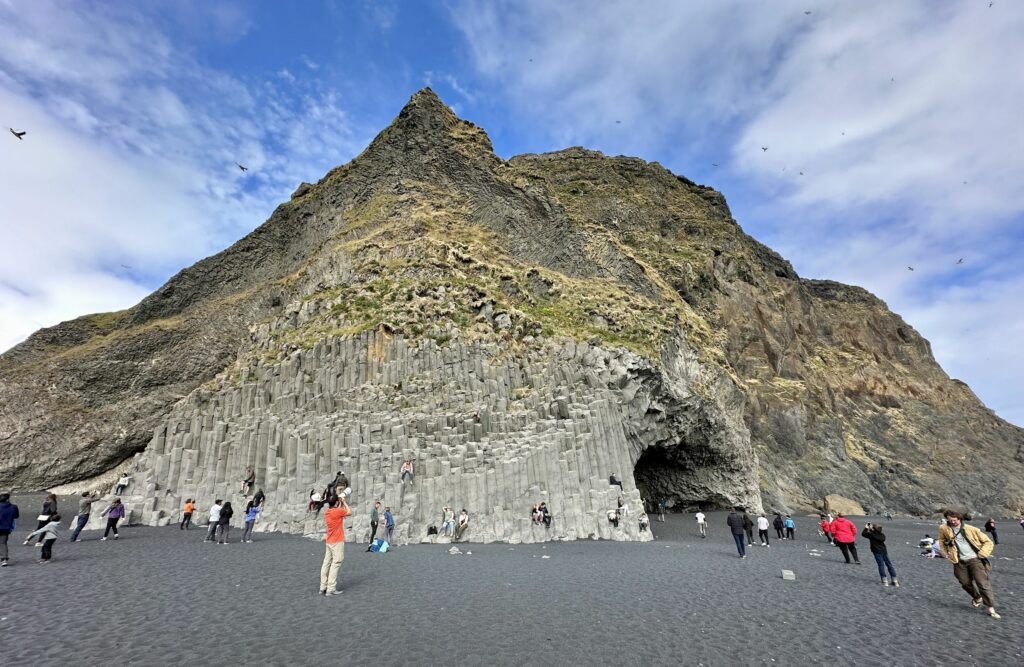 Der Strand ist nach dem darüber liegenden Berg, dem Reynisdrangar (Drei Trolle), benannt. Er wird von drei riesigen Basaltströmen gebildet, die wie ein unregelmäßiger Stapel aussehen.