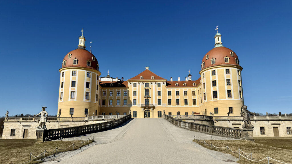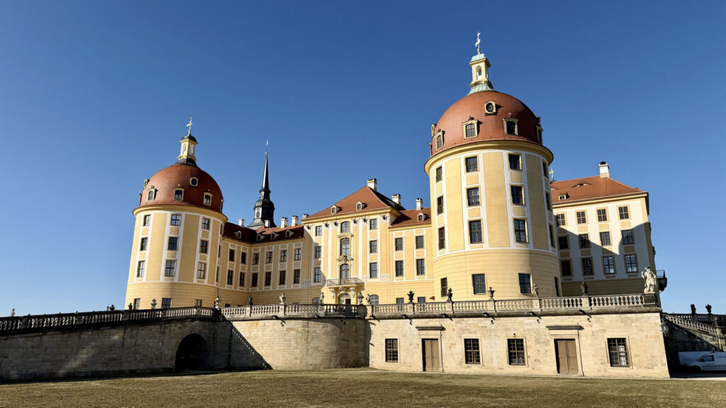 Nur etwa 15 Kilometer von Dresden entfernt liegt das märchenhafte Schloss Moritzburg. Das barocke Wasserschloss wurde im 18. Jahrhundert unter August dem Starken zu einem prunkvollen Jagd- und Lustschloss ausgebaut. Mit seinen vier runden Türmen spiegelt sich das Schloss eindrucksvoll im umliegenden Schlossteich und gehört zu den beliebtesten Ausflugszielen der Region.