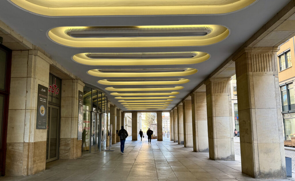 Ein besonders schönes Beispiel sind die markanten grünen „Marmorsäulen“ in den Vestibülen der Semperoper. Viele halten sie für echten Marmor – tatsächlich sind sie ein beeindruckendes handwerkliches Imitat. Die Säulen bestehen aus Ziegeln und Gips und wurden mit einer speziellen Technik so marmoriert, dass sie täuschend echt wirken.