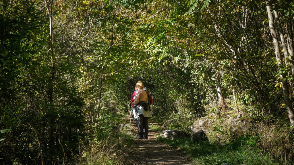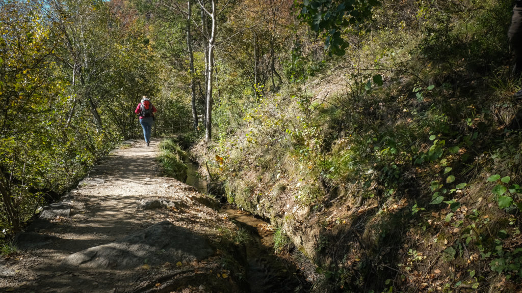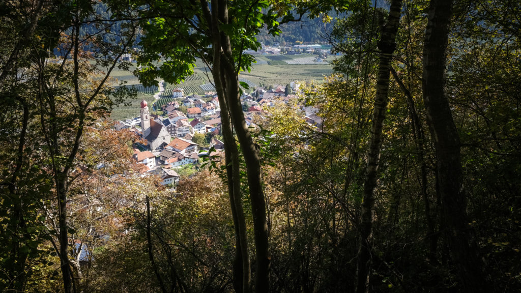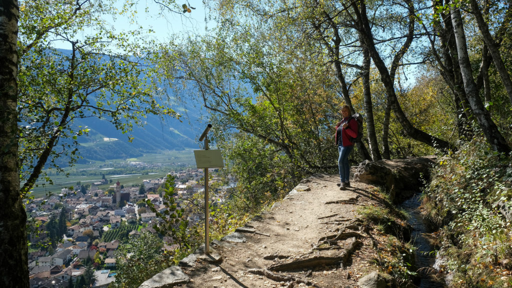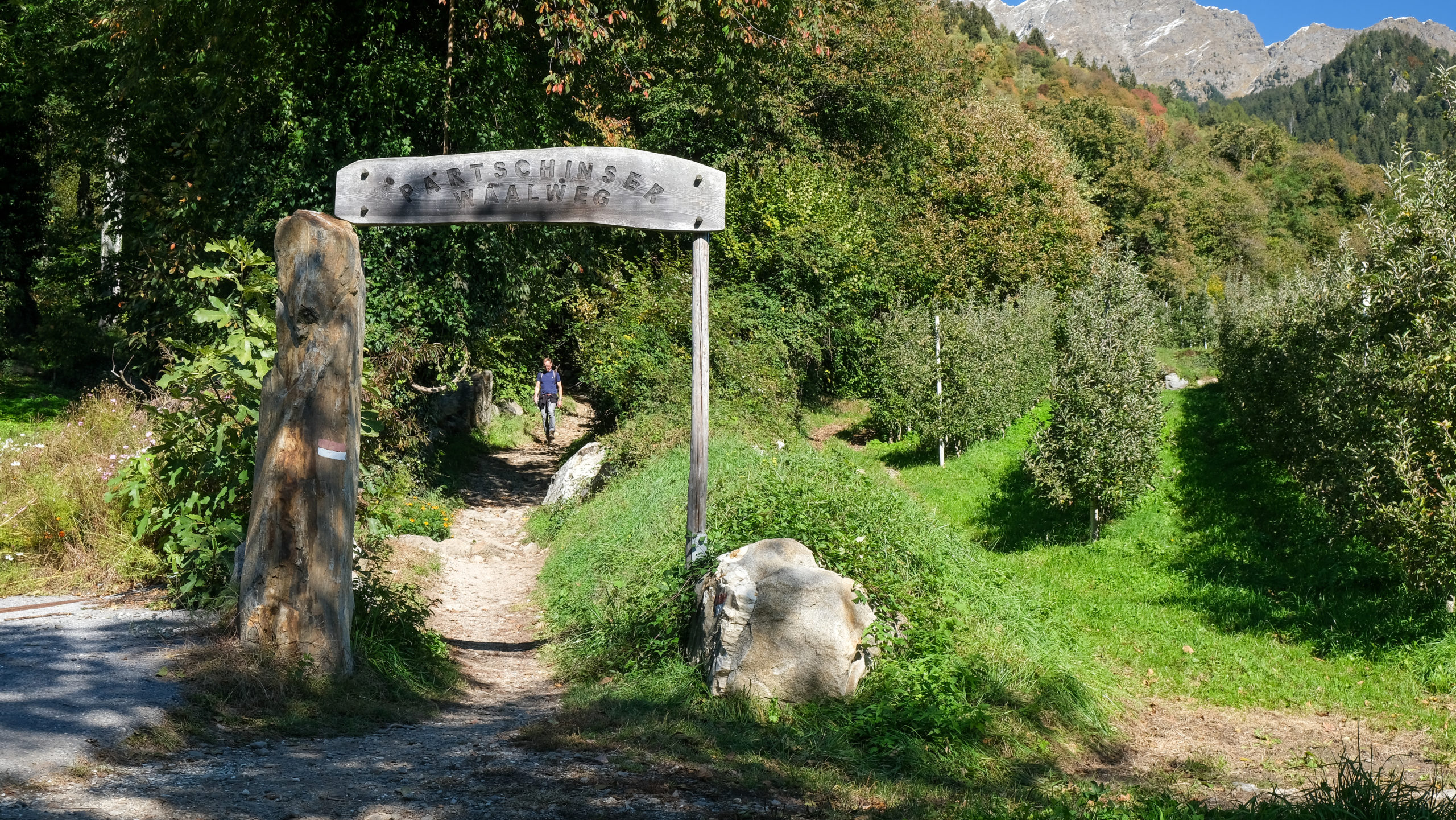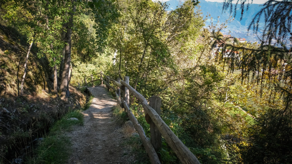 Unsere Wanderung starteten wir am „Graswegerkeller“ oberhalb von Partschins. Dort war einer der wenigen freien Parkplätze die man in der Nähe finden konnte. Zu Fuss ging es zirka fünfhundert Meter weiter bis zum Partschinser Waalweg. Nach einem kleinen Anstieg bogen wir nach links in Richtung „Gasthaus Birkenwald“ ab. Eine leichte Wanderung mit einer schönen Aussicht auf den gleichnamigen Ort und das Meraner Umland. Der Weg führt als an einem künstlich angelegten Bewässerungsgraben entlang.