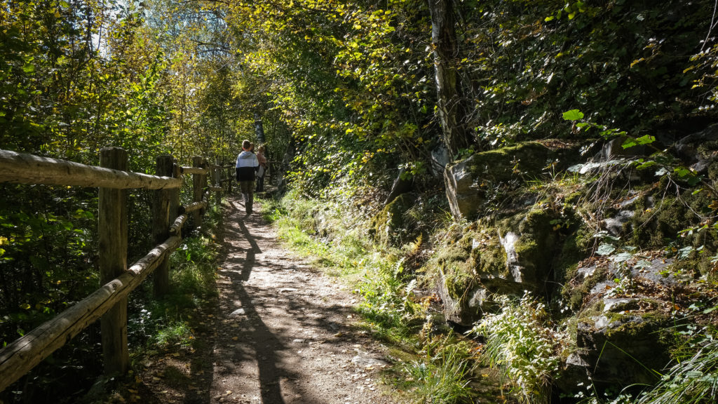 Noch unterhalb des Gasthauses, am Parkplatz zum Waalweg, trennte sich unsere Wege. Meine Schwiegermutter blieb dort und ruhte sich aus. Während wir zu dritt weiter den Weg folgten, da ich unbedingt den Wasserfall aus der Nähe sehen wollte. Nach einem weiteren steilen Anstieg sind meine Frau unser Sohn dann doch lieber zur Schwiegermutter zurück gegangen. Während ich noch zehn Minuten erbat um zu schauen, ob ich den Wasserfall doch noch zu Gesicht bekam. Ich gab echt Gas und rannte zum Teil mit meinem Wanderrucksack den Anstieg hoch. Richtig fies wurde es am „Gasthaus Birkenwald“. Ein Stück unterhalb kam ich vom Wanderweg auf die Strasse und die ging richtig steil hoch. Der Anstieg lohnte sich. Ich schaffte es zeitlich zwar nicht mehr in unmittelbarer Nähe des Wasserfalles. Dafür bekam ich diesen zu Gesicht und somit vor meiner Kamera. Der Anstieg hatte sich gelohnt.