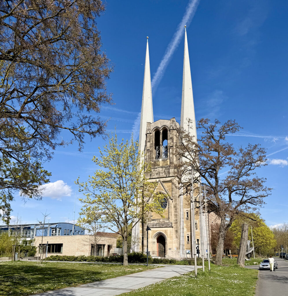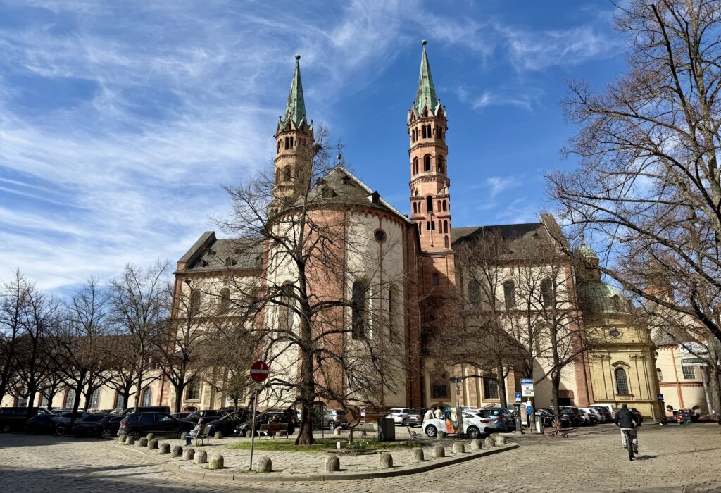 St.-Johannis-Kirche: Die markanten zwei schlanken, spitzen Türme sind typisch für diese Kirche – deshalb wird sie in Würzburg sogar umgangssprachlich „Batman-Kirche“ genannt.