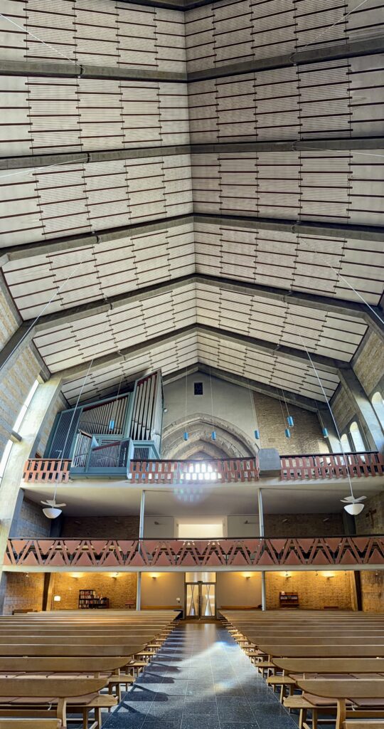 Die heutige Form stammt aus dem Wiederaufbau nach dem Zweiten Weltkrieg: Der alte Turmstumpf wurde erhalten und rechts und links mit diesen auffälligen modernen Spitz­türmen ergänzt.